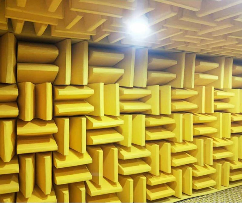 全消音室墙壁、地面、顶面六个面均安装玻璃纤维的消音尖劈,为了方便工作人员行走,地面架设了人行道或悬空钢丝网架。在外界噪声较高或要求测振动的情况下,采用浮筑结构以隔离外界的影响,在浮筑结构中起关键作用的减振材料,在实际工程中,采用什么样的减振取决于要求的本底噪声指标及周围的环境噪声而定。